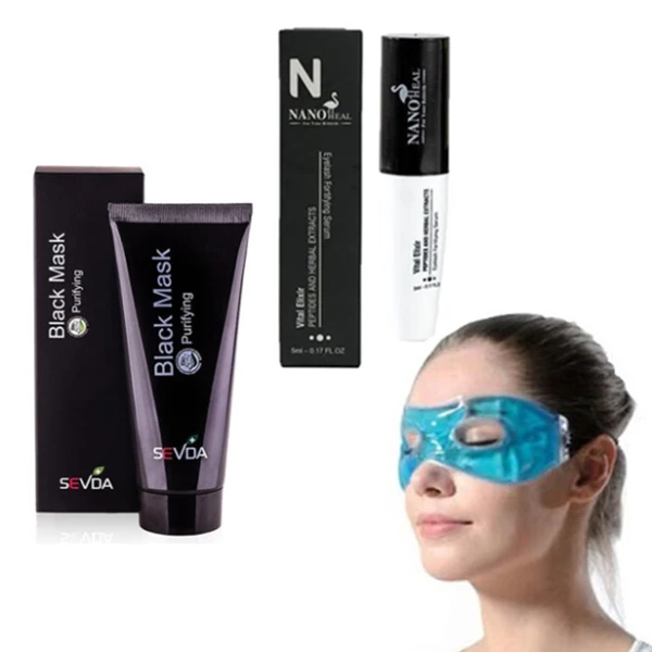 گلد پکیچ زیبایی چشم شامل: ماسک صورت زغال سودا عینک ژله ای سرد و گرم سرم ضد ریزش و تقویت مژه نانوهیل