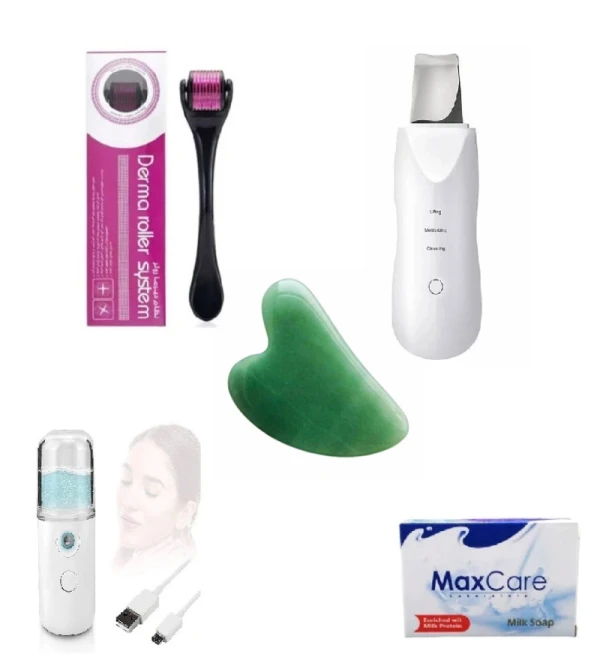 پکیج نقره ای پوست شامل: صابون شیر مکس کر درمارولر دی آر اس سیستم بخور صورت نانو اتو صورت و سنگ ماساژ گواشا طبیعی و درمانی