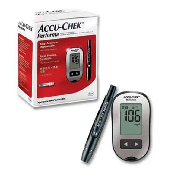 دستگاه اندازه گیری قند خون خانگی پرفورما (accu chek perfoma) با حداقل خون مورد نیاز، دارای دقت بالا و قابلیت میانگینگیری از نتایج 7، 14، 30 و 90 روز بوده و منبع تغذیه آن باتری غیر قابل شارژ میباشد که در صورت اتمام دستگاه هشدار تعویض باتری را نمایش میدهد.