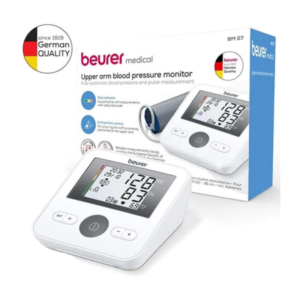 دستگاه فشار خون بیورر Beurer BM27 محصول شرکتBeurer و ساخت کشور آلمان میباشد، این محصول بوسیله شرکت آرمین درمان وارد کشور و گارانتی شده است. فشارسنج دیجیتالی Beurer BM27 یک دستگاه فشارخون در کلاس خانگی میباشد و قابل بهره برداری برای افرادی با همه نوع فشارخون و اندازه دور بازوی 23-32 س.م است.