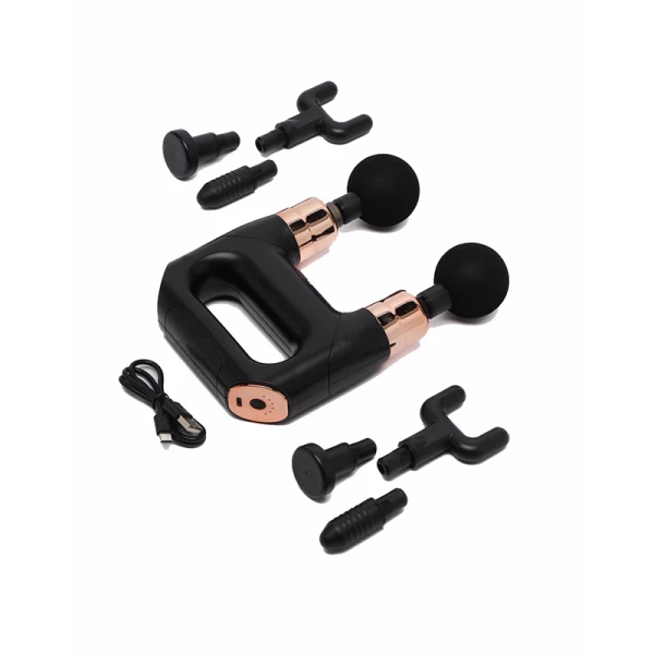 این محصول جدیدترین نوع ماساژور است که داراری دوسر است که همزمان عمل میکنند و انجام ماساژ را با قدرت ،شدت و سرعت بسیار بهتری انجام میدهد و ماساژ را بسیار لذت بخش تر میکند.این تفنگ ماساژ با یک موتور قدرتمند و بی صدا باعث تسکین بافت عمیق از سر تا پا می شود. طراحی ارگونومیک دارای دسته ای با قابلیت گرفتن آسان است که کاملاً در دست شما قرار می گیرد و یک وسیله راحت برای استراحت و ماساژ می باشد و می توانید عضلات و بدن را آرام و بدون درد نگه دارید. این ماساژور با دو سری ویبره برای پاها، پشت و گردن باعث آرامش عمیق عضلات شما پس از یک تمرین سخت یا یک روز کاری می شود. تفنگ ماساژ دو سر به بهبود جریان خون در بافت ها، بهبود حرکت لنف و همچنین از بین بردن اسپاسم و گیره کمک می کند. تفنگ ماساژ ضربه ای شارژی دارای 8 سری قابل جابجایی (4 نوع نازل، هر کدام 2 عدد) است که بسته به ناحیه ماساژ به راحتی قابل تغییر است با حداکثر تعداد دور 3200 دور در دقیقه و با 6 حالت سرعت، به شما امکان می دهد یک حالت ماساژ راحت را فقط برای خود انتخاب کنید. همچنین دارای باتری داخلی 1500 میلی آمپر ساعتی است . وزن آن حدود 600 گرم است که به شما امکان می دهد آن را با خود به باشگاه یا مسافرت ببرید.سری توپ مانند: برای عضلات کوچک و بزرگ بدن سری فلت : برای تمام قسمت های بدن سری چنگال شکل: برای گردن و ستون فقرات سری مارپیچ : برای گرفتگی عضلات و مفاصل