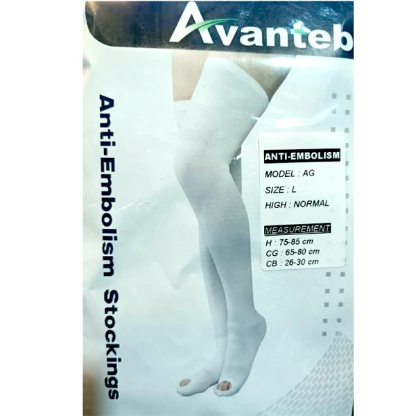 جوراب ضد آمبولی آوان طب محصول کشور ایران می باشد .جنس جوراب از الیاف بسیار نرم و ضدحساسیت لایکرا ساخته شده است که سهولت گردش خون را بواسطه فشار در قسمت مچ پا بر آورده می سازد که این فشار استاندارد تا حدود 14 میلیمتر جیوه تعدیل یافته و با ایجاد گردش خون از بروز ترومبوز وریدی جلوگیری به عمل می آورد .